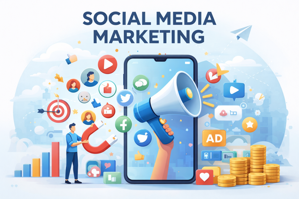 Social media marketing focuses on promoting brands through platforms like Instagram, Facebook, LinkedIn, and X. It emphasizes engagement, visibility, and direct interaction with audiences.